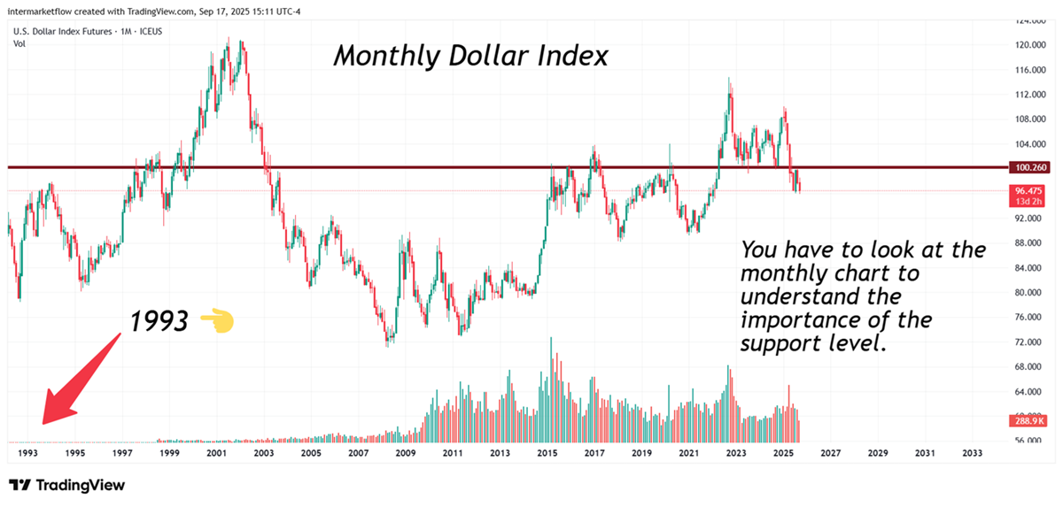 Technically, the dollar is at an inflection point. It broke and is now retesting a key support zone around the 100 level.