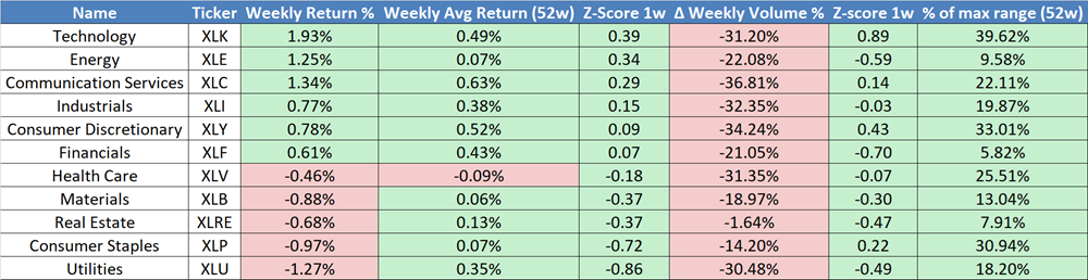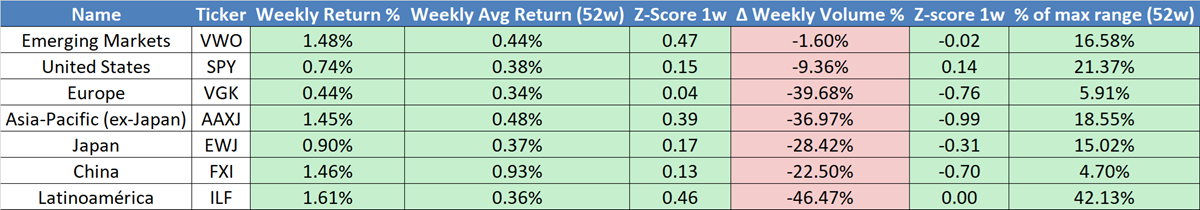 Emerging markets outperformed this week—risk on! Yet volume collapsed everywhere except in EM and the U.S., where it only slipped 10%.
