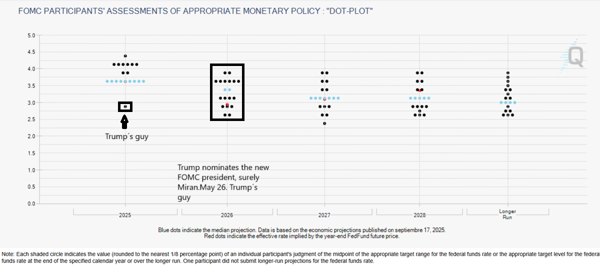 For 2026, the Committee sees rates between 4% and 2.5%—a huge dispersion.Stephen Miran (Trump’s guy) will be Chair, Powell still on the FOMC though.