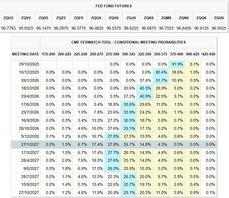 As you can see, the market is almost certain about a 25 bp cut for the October meeting. On top of that, it already has a fairly firm view of the rate path through April 26.
